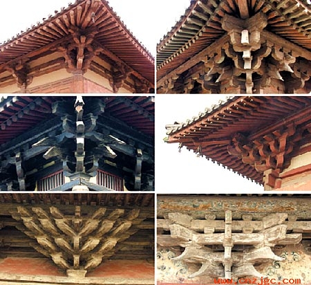 几种不同时代的斗拱:唐、五代(上)、宋、辽(中)、金、元(下)