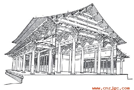 从立面处理上看,建筑的柱子多带有侧脚(柱头向内微微倾斜)和生起(建筑从中央的柱子到角柱逐渐增高)。它们不但可与屋顶的曲线轮廓相协调,而且可产生一种向建筑物中心挤压的力量,使整幢建筑的榫卯结合得更紧密。