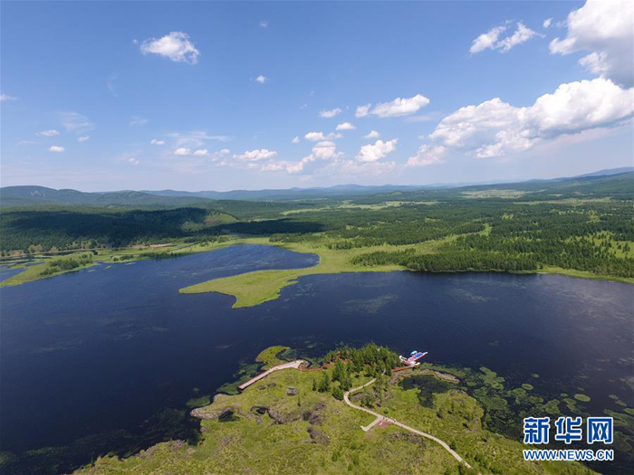 这是阿尔山火山熔岩堰塞形成的杜鹃湖(7月1日无人机航拍) 新华社记者 刘磊摄