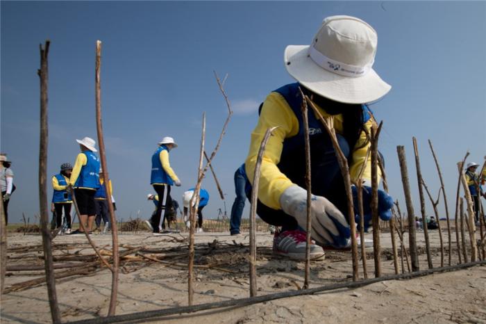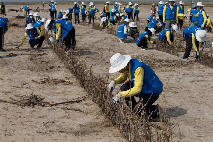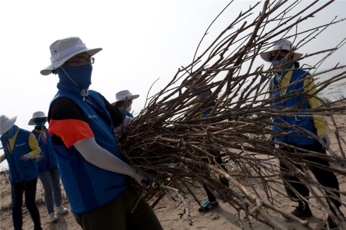 大学生志愿者在内蒙古治沙