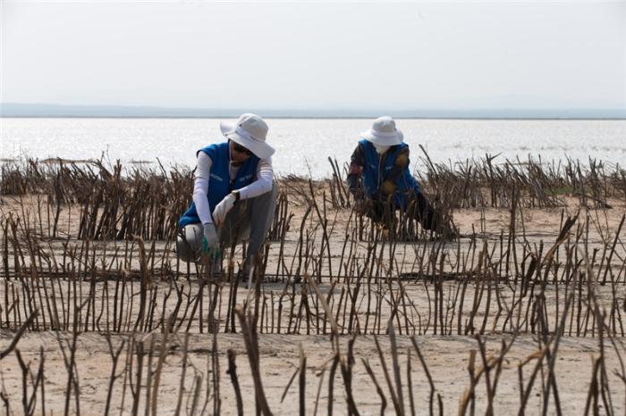 7月19日,参加“内蒙治沙大学生志愿行动”的大学生志愿者,来到内蒙古自治区锡林郭勒盟正蓝旗宝绍岱诺尔开展治沙活动,他们将通过建设沙障、种植耐碱植物等方式吸碱压尘、控制盐碱尘暴。